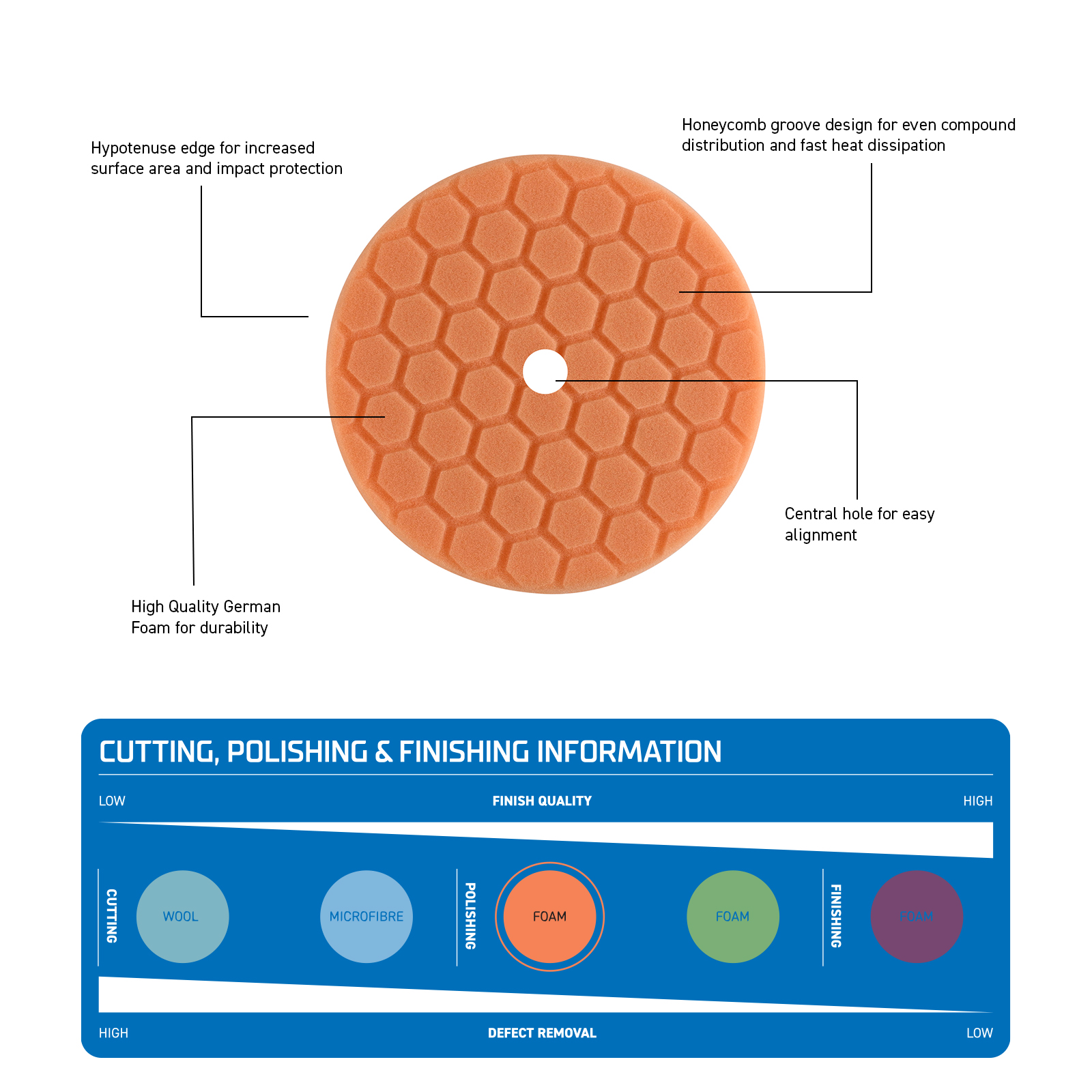 Kincrome Foam Polishing Pads are made from a durable polyester sponge and feature a honeycomb groove design for even compound distribution and improved heat dissipation.